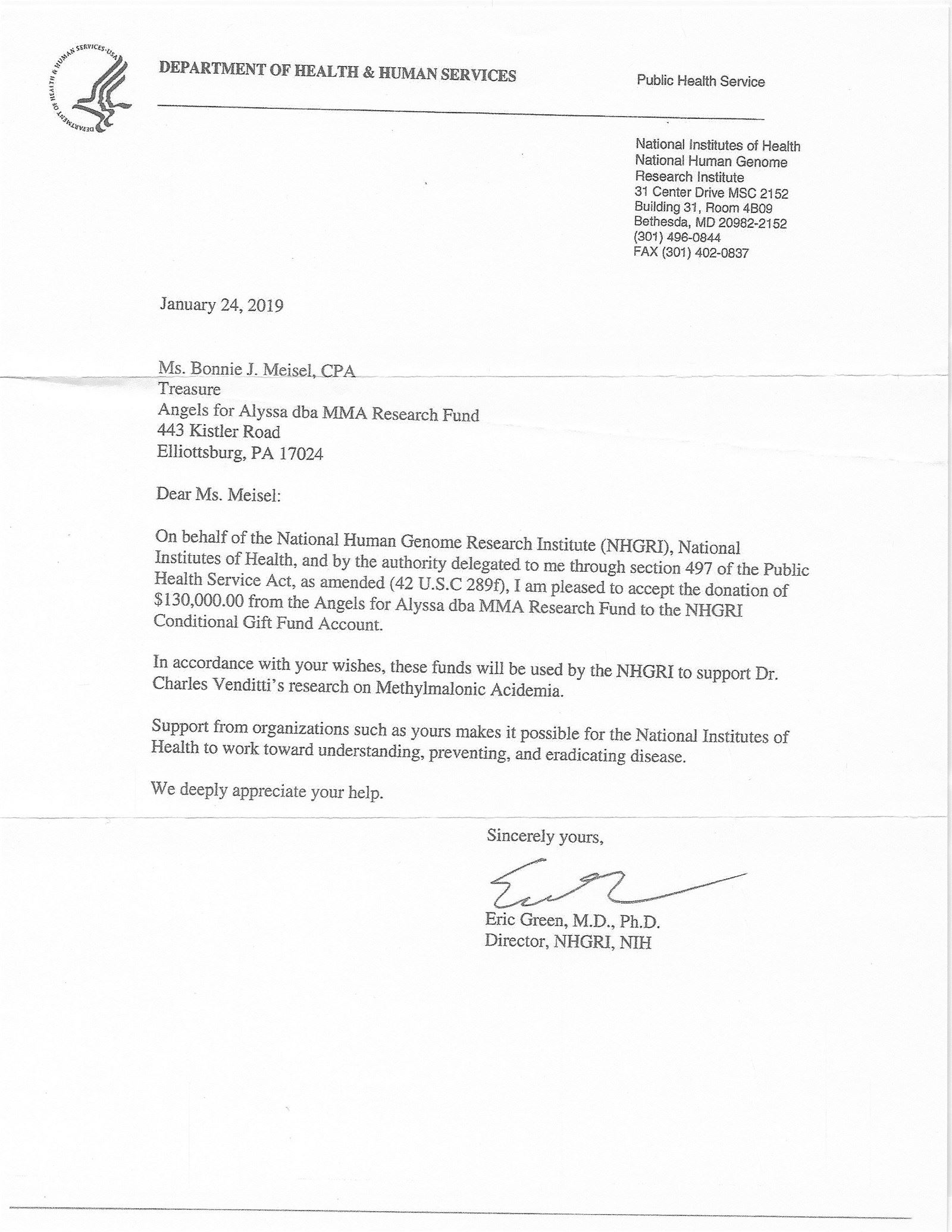 Beginning January 1, 2010, Angels for Alyssa assumed the administration of the MMA Research Fund when it established a donor agreement directly with National Institutes of Health. As administrator of the fund, Angels for Alyssa processed donations received globally as well as the proceeds from various fundraising events held by several families and friends afflicted with MMA.